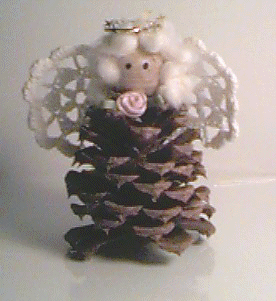 DIRECTIONS: I spray the cone first with acrylic sealer and let dry. I leave mine natural, but you can spray paint if you prefer. They also look pretty gold. Glue wood ball to top of cone (you may have to remove some of the cone in order to make the head rest evenly. Glue small rose to neck (or decorate any way you choose} Glue hair and halo, paint dot eyes and rosy cheeks. Glue small heart shaped doily to back for wings.