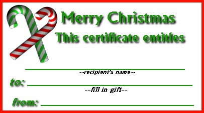 Download this premade gift certificate and print it out on your printer. Simply fill in the recipient's name...the gift (such as a week's chores, one back rub, starting the car in the cold) and sign it. Makes great stocking stuffers.